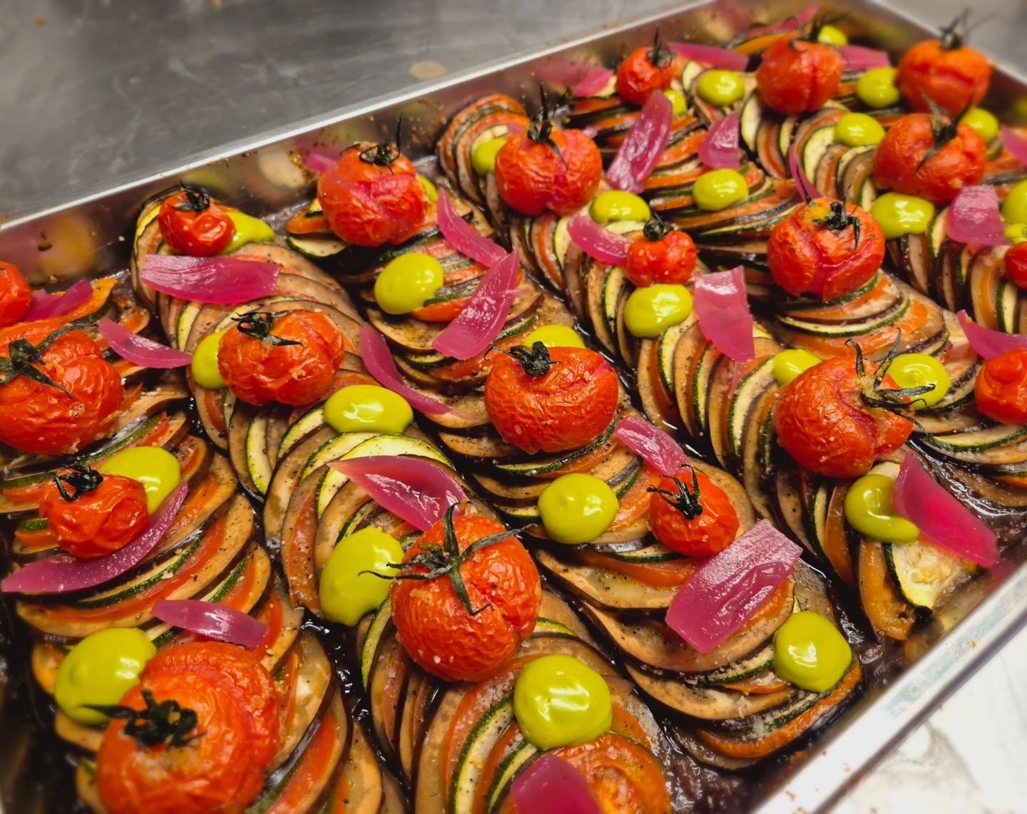 Bayaldi - aubergine/tomaat/courgette/basilicum/ui