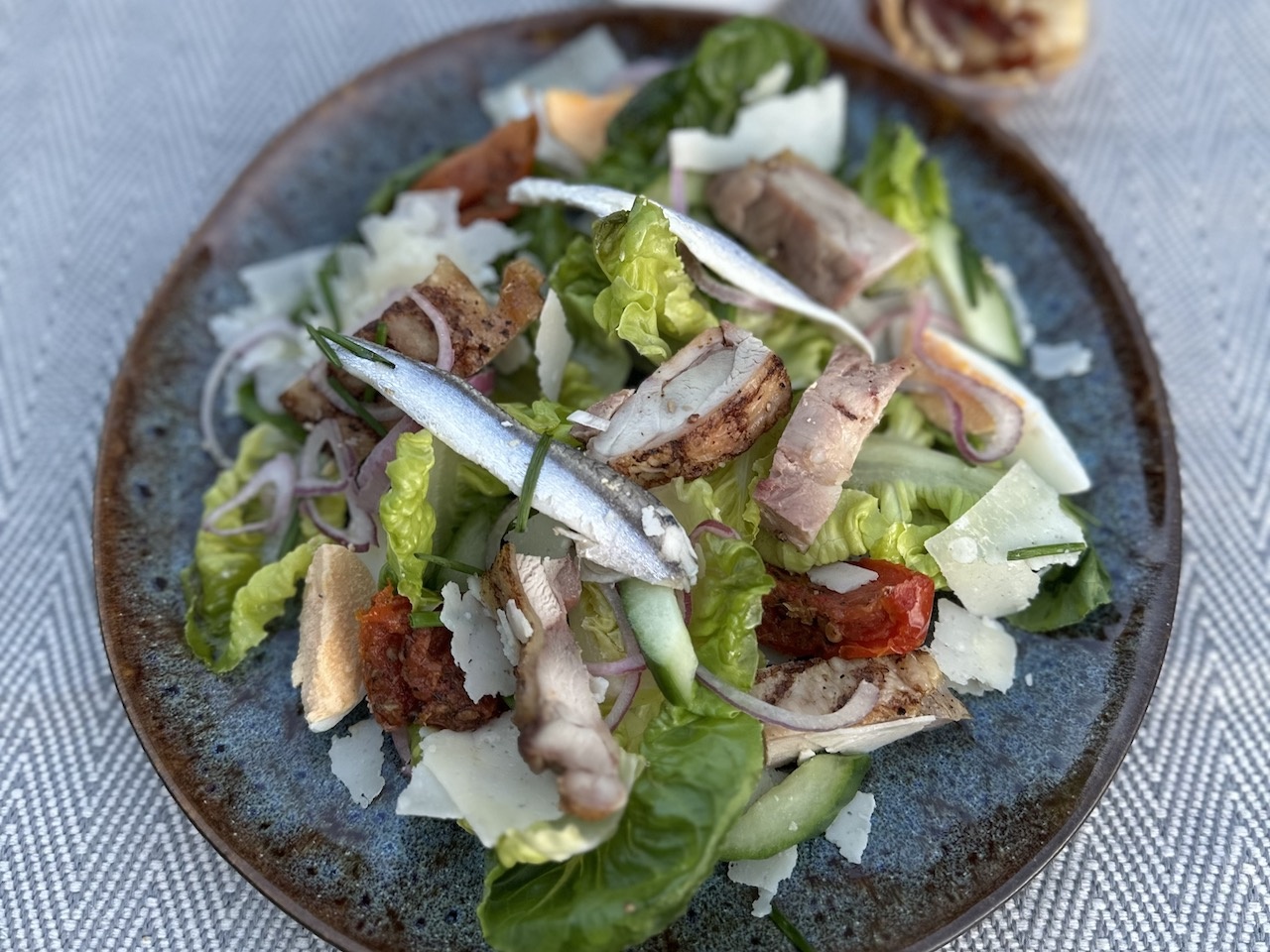Caesar salade met EKO kip, ansjovis, gegrilde little gem, ei, parmezaan, croûtons;