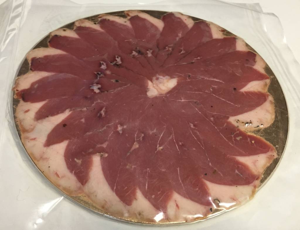 Gerookte eendenborst, in plakjes.