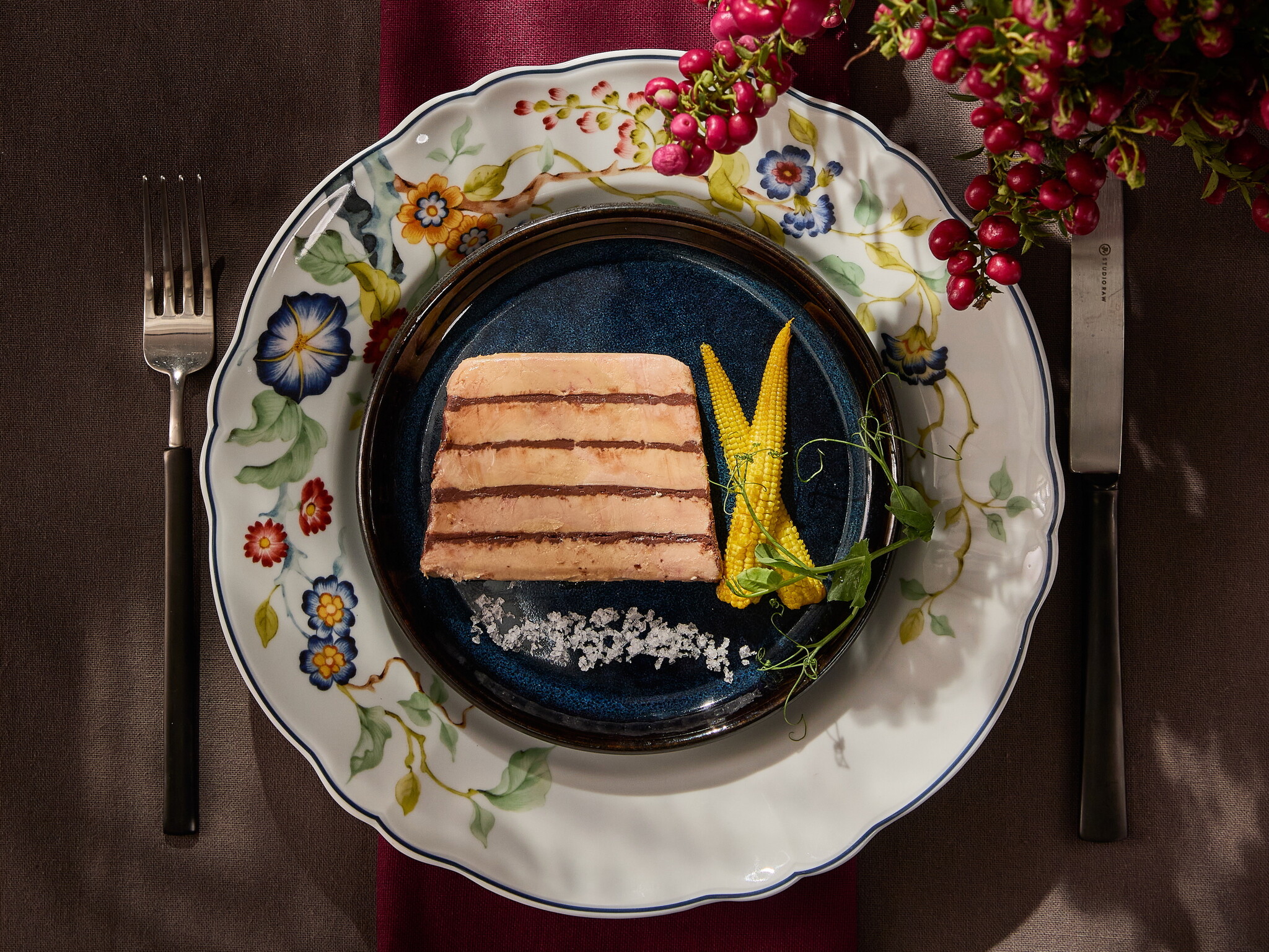 Eendenleverterrine/pure chocolade/minimais zoetzuur/balsamicostroop