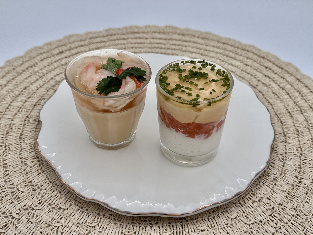 Amuseglaasje met ei mimosa, gemarineerde zalm, mierikswortel en bieslook.
