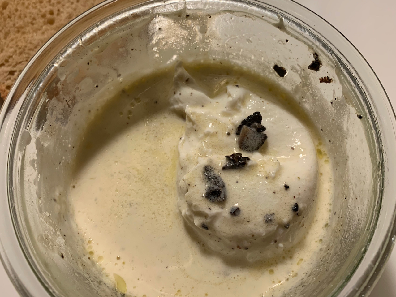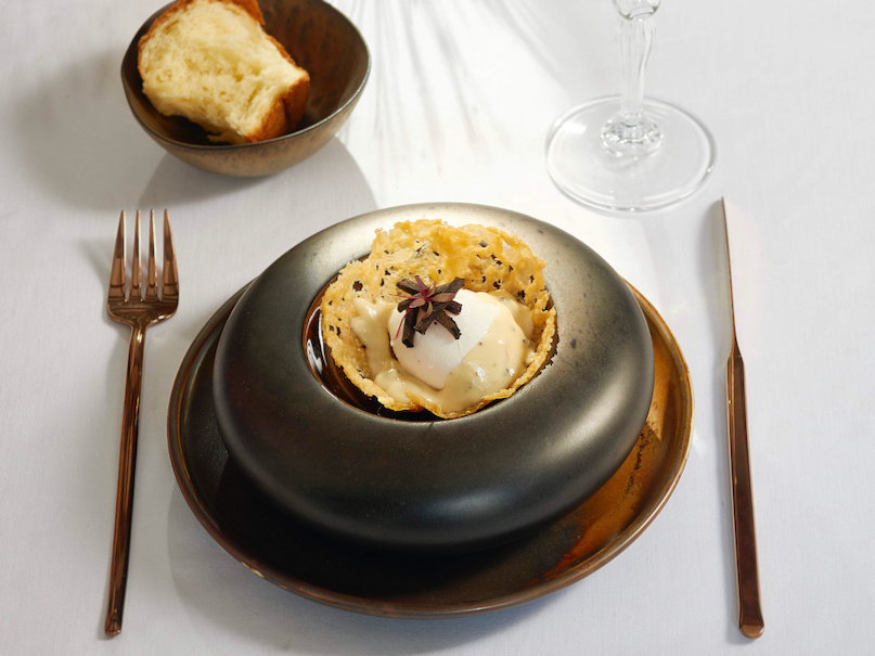 Getruffeerd ei: gepocheerd dagvers scharrelei, zwarte wintertruffel/parmezaansaus.