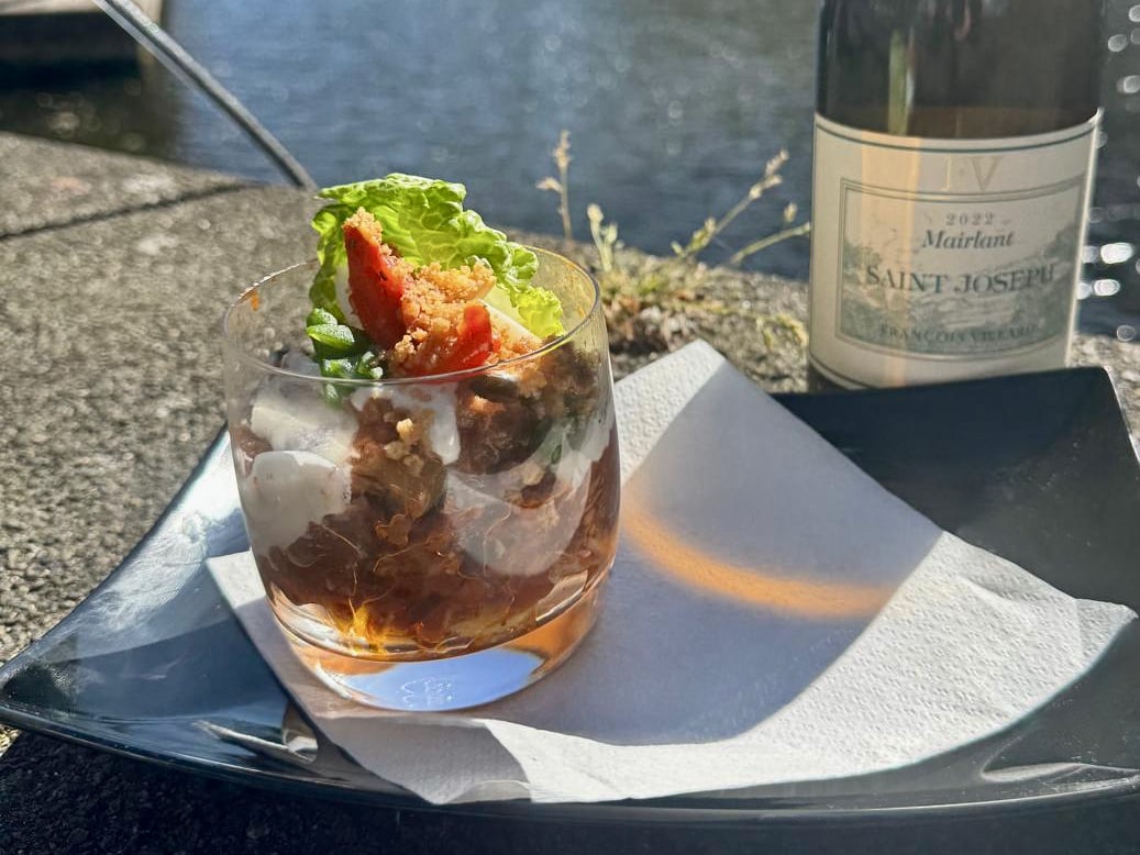 Glaasje met salade Niçoise: tonijn, dagvers scharreleitje, gepofte tomaat en crumble.
