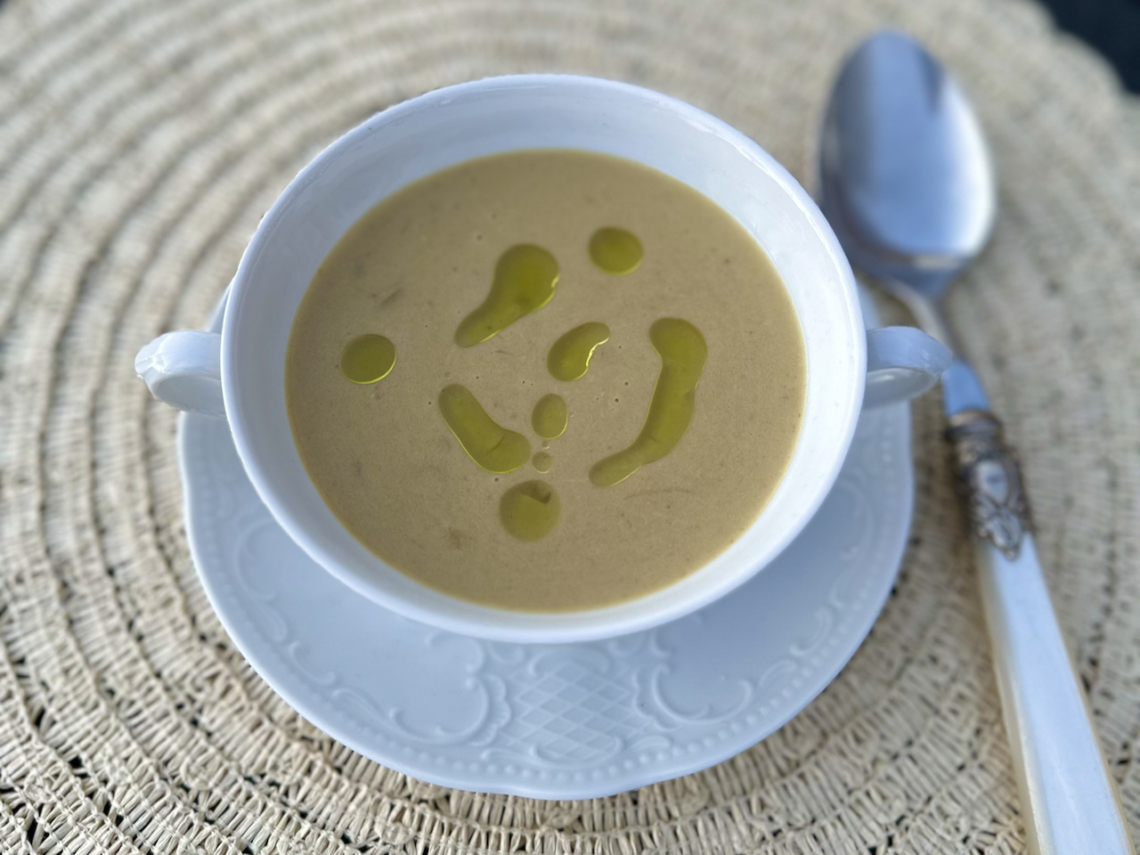 Smaakvolle, romige soep van knoflook en lenteui; met daslookolie (apart verpakt).