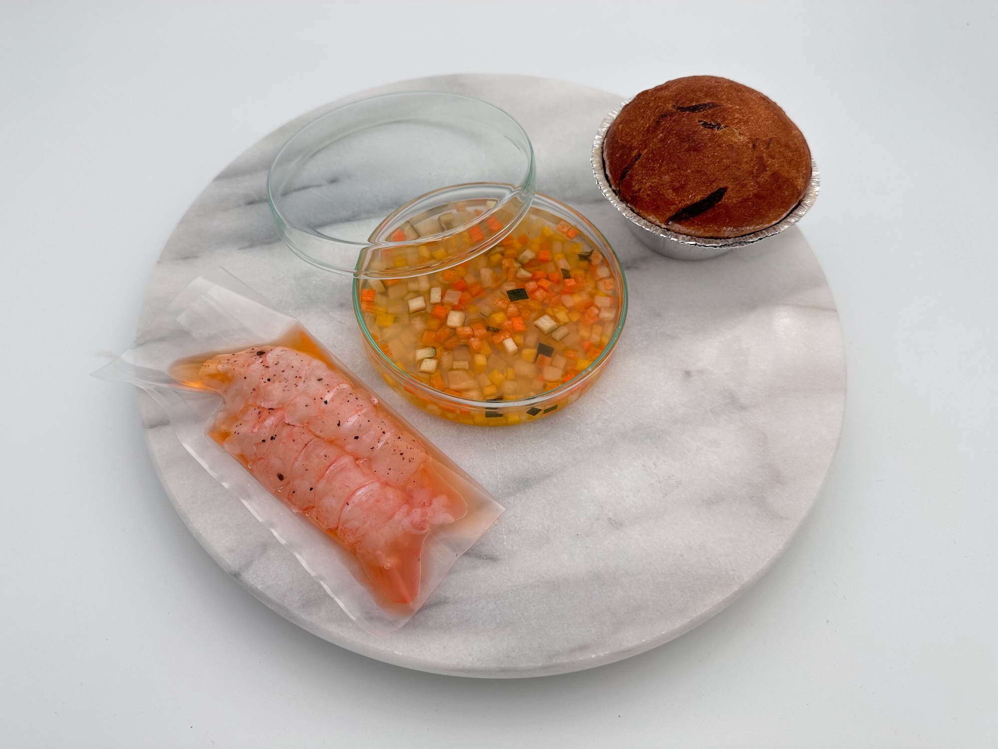 Prijs voor petrischaaltje, langoustine en de brioche (laatste twee zijn apart verpakt).