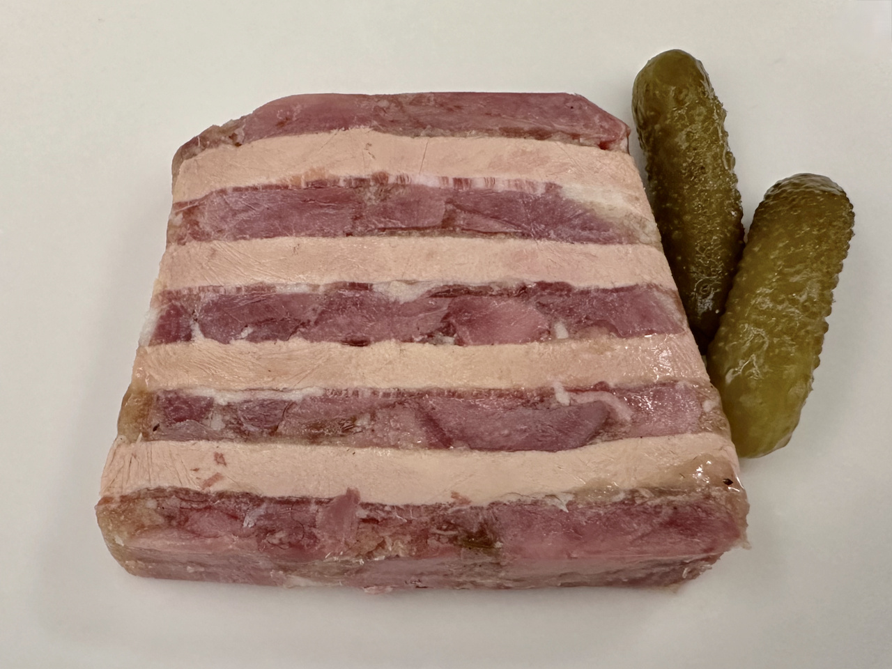 Fijngelaagde, smaakvolle marbré van runderwang, eendenlever, pata negra en kalfsjus.