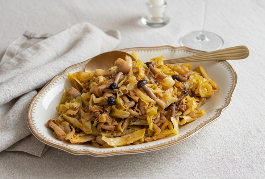 Gebakken spitskool met aromatische roze peperkorrels, vadouvan, bundelzwam en amandel.