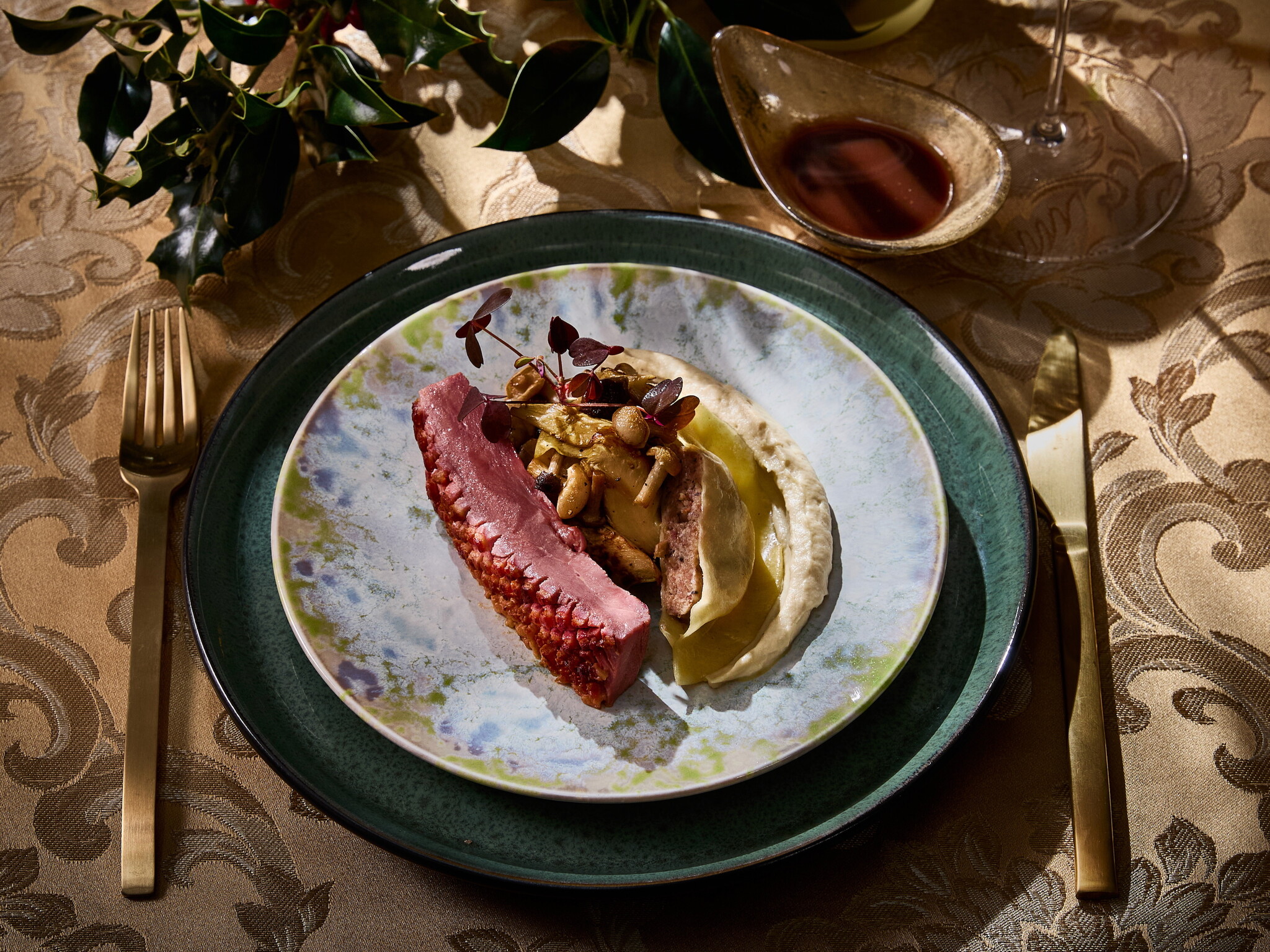 Tamme eend: canette met raviolo gevuld met eendenbout, artisjok en eendenjus.