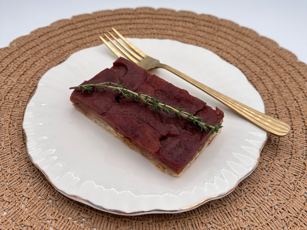 Tarte tatin met peer, blauwe kaas en rode wijnreductie.