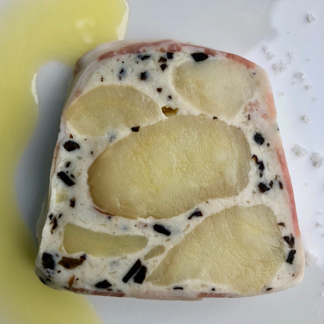 Terrine 'royale': wintertruffel, rosevalaardappel, spek, crème fraîche en sjalot.